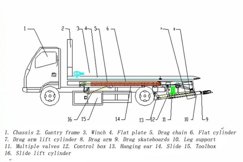 ●يأتي مصدر الطاقة الرئيسي لهيكل شاحنة الإنقاذ المسطحة من النظام الهيدروليكي.