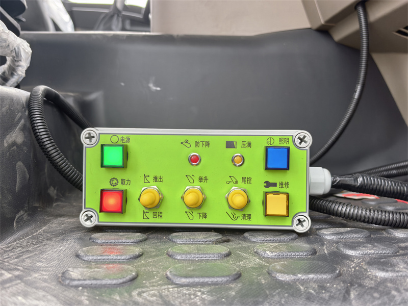 • Cab-mounted electrical control box: power switch, power take-off switch, lights, tailgate anti-lowering indicator light, garbage full warning light, maintenance warning light, loader lifting/lowering, pusher extension/retraction, and cleaning function.