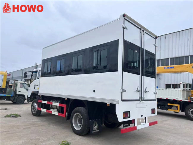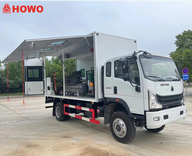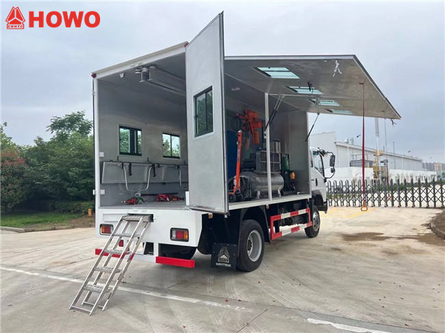 تتميز مركبة الصيانة المتنقلة HOWO 4x4 بالمواصفات التالية: كابينة HOWO 1880 أحادية الصف، قاعدة عجلات 3360 مم، محرك Weichai WP3NQ140E50، علبة تروس WLY6G120، صندوق شحن بأبعاد 4200 × 2100 × 2000 مم، لوحة جانبية يمنى بتصميم جناح ودعم تلسكوبي، نوافذ، لوحة سفلية من سبائك الألومنيوم، إضاءة داخلية، وأدوات صيانة تشمل ضاغط هواء، مولد كهربائي، أرفف مصممة خصيصًا، رافعة هيدروليكية قابلة للطي، خزانة أدوات، وخزانة وقود.آلة مزودة بفوهة إعادة تعبئة وبكرة خرطوم زيت بطول 10 أمتار، سلم، أسطوانات أكسجين، أسطوانات أسيتيلين، آلات قطع الغاز واللحام الهيدروليكي،آلة تجليخ الأقراص اليدوية، مطفأتا حريق، إلخ.
