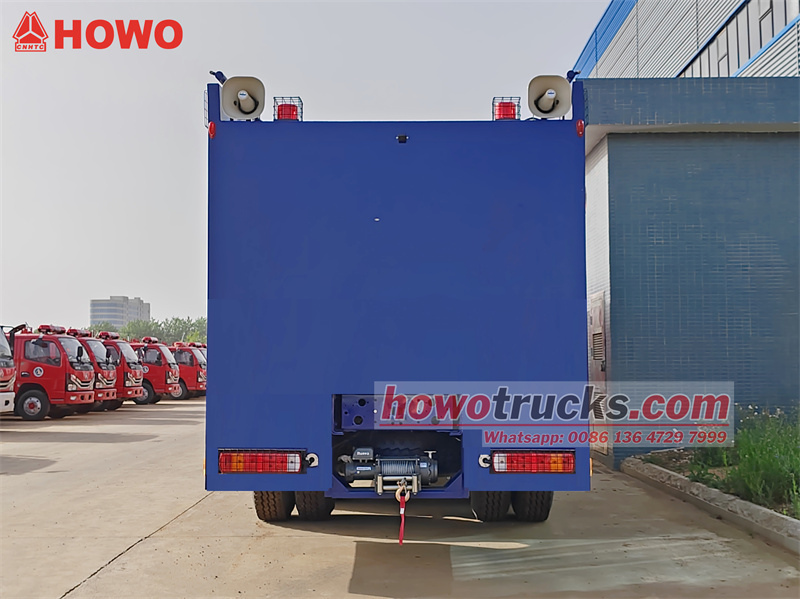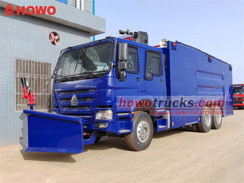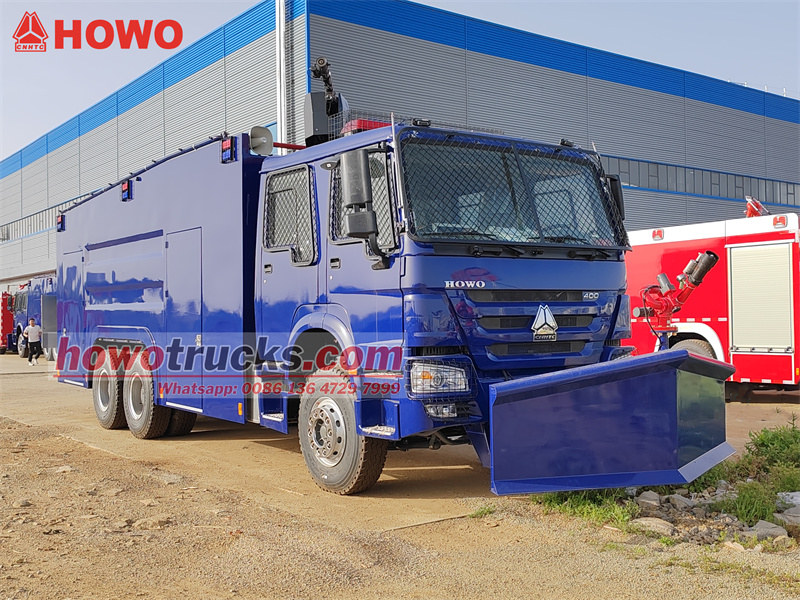 شاحنة مدفع المياه المقاومة للانفجار HOWO 6x4 مُعدّلة من هيكل HOWO HW76 ذي الكابينة المزدوجة. تتميز بقاعدة عجلات 4600+1350 مم، ومجهزة بمحرك WP12S400E201 وعلبة تروس HW19710. تحتوي الشاحنة على صندوق مقاوم للانفجار، ومدفع رئيسي في الأعلى، ومدفع مياه أمامي ثابت، مما يُمكّنها من السيطرة على الشغب من جميع الجهات وبتدفقات كبيرة ولمسافات طويلة. تضم كابينة مزدوجة وطاقمًا من 6 أفراد. تبلغ سعة خزان المياه 10000 لتر، وخزان الرغوة 100 لتر، وخزان الصبغة 100 لتر، وخزان رذاذ الفلفل 100 لتر. وهي مزودة بمضخة حريق CB10/60. أما مقدمة الشاحنة، فهي مُجهزة بألواح فولاذية مضادة للشغب وجرافة فولاذية هيدروليكية قوية لإزالة العوائق.