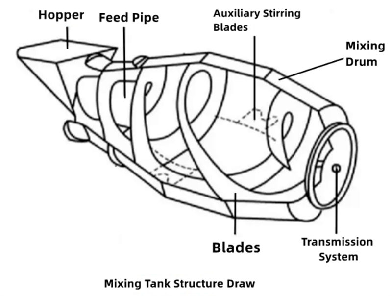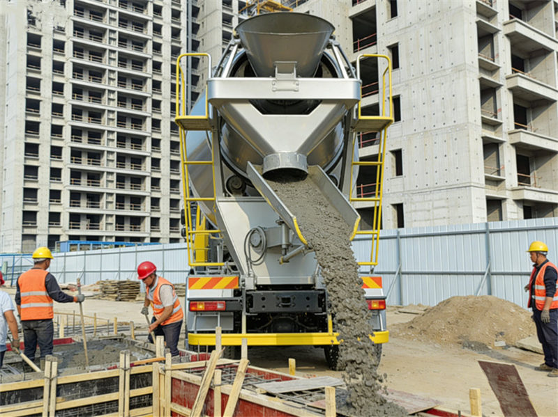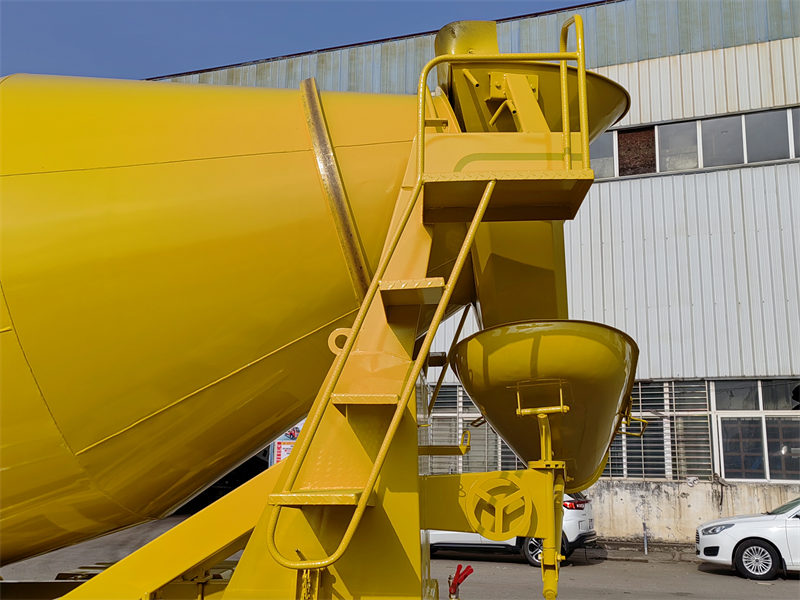 ▶ خلط: تدور أسطوانة الشاحنة باستمرار أثناء النقل، مما يضمن بقاء الخرسانة في حالة سائلة وخلطها بشكل متجانس. ويتم تشغيل دوران الأسطوانة بواسطة نظام هيدروليكي يقع عادةً في مقدمة الشاحنة.
