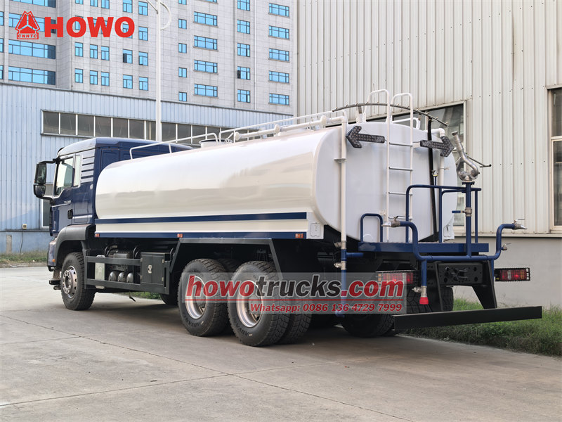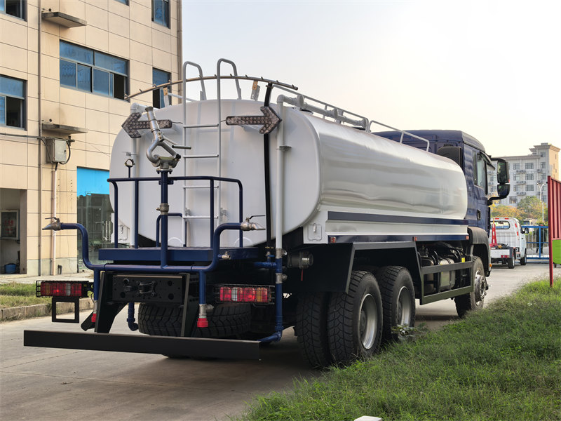 stainless steel tank, 6×6, RHD is optionalشاحنة رش المياه HOWO TX 18000L هي مركبة نظافة متعددة الوظائف ذات سعة عالية، مبنية على هيكل HOWO TX شديد التحمل، وتتميز بخزان مياه رئيسي بسعة 18000 لتر. تعمل الشاحنة بمحرك ديزل Weichai بقوة 380 حصانًا وناقل حركة يدوي بعشر سرعات، مما يوفر أداءً قويًا وقدرة تحمل عالية. الخزان مصنوع من فولاذ كربوني بسماكة 5 مم ومطلي بطبقة مقاومة للتآكل، بينما يتضمن هيكله الداخلي أربعة أقسام وحواجز مضادة للاندفاع لتعزيز ثبات القيادة. تتضمن المركبة نظام مضخة طرد مركزي من Weilong، يدعم التصريف الذاتي والتشغيل بمعدل تدفق 60 متر مكعب/ساعة. كما أنها تتميز بنظام رش متعدد الأوضاع، بما في ذلك الشطف الأمامي، والرش الخلفي، والرش الجانبي، ومدفع مياه عالي الضغط بمدى 28 مترًا، مما يجعلها مناسبة لتطبيقات متنوعة مثل التشجير الحضري، وقمع الغبار، والتبريد، ومكافحة الحرائق في حالات الطوارئ.