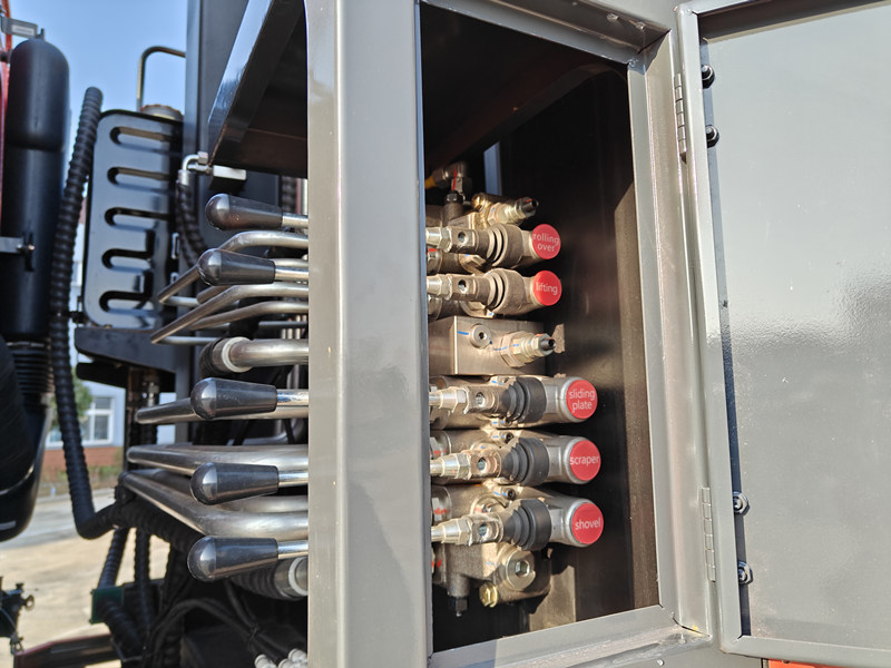 ►تتميز هذه الآلة بسهولة التشغيل والتحكم. تقع صناديق التحكم في كل من مقصورة القيادة ومؤخرة المركبة. يتولى صندوق التحكم الموجود في مقصورة القيادة إدارة عملية الدفع والتفريغ، ويتيح اختيار وضع التشغيل (تلقائي أو يدوي)، بينما يتولى صندوق التحكم الخلفي إدارة آليات الضغط والإمالة. التشغيل في غاية السهولة.